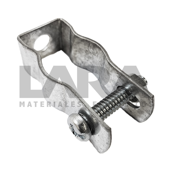 Abrazadera metálica tipo Caddy con perno incorporado, diseñada para la fijación segura a muros de tuberías o ductos eléctricos EMT y canalizaciones en general.