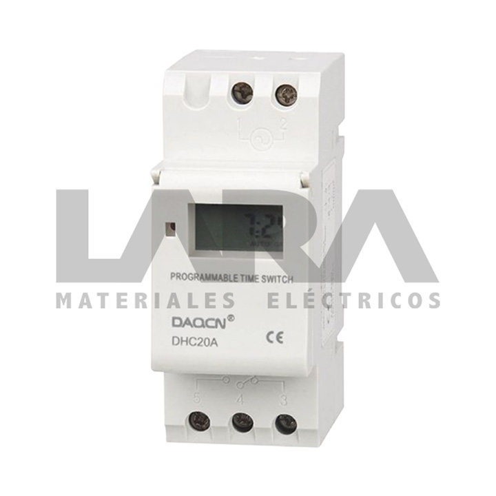 Reloj interruptor horario digital DHC20A diseñado para automatizar el encendido y apagado de circuitos eléctricos con alta precisión. Permite establecer múltiples programas, controlando de forma eficiente la operación de equipos eléctricos, contribuyendo al ahorro energético y optimización de procesos en aplicaciones industriales, comerciales y residenciales.